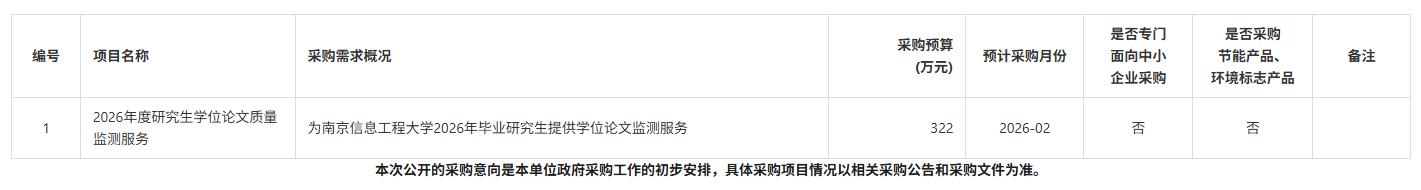 为便于供应商及时了解政府采购信息,根据《江苏省财政厅关于做好政府采购意向公开工作的通知》等有关规定,现将南京信息工程大学2026年1月(第1批)政府采购意向公告如下: